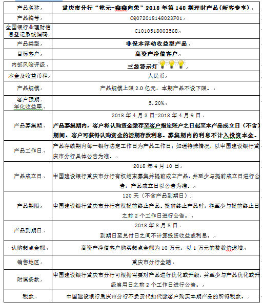 中国建设银行重庆市分行“乾元-鑫鑫向荣” 2018年第148期理财产品风险揭示书和说明书