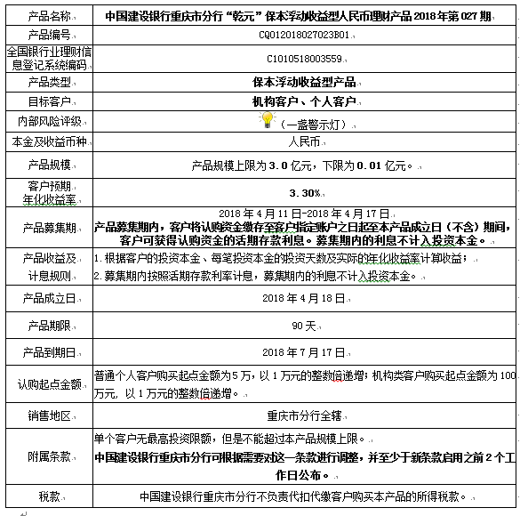 1.本产品规模上限:3.0亿元。在本期产品募集期内,对本期产品的认购金额达到本期理财产品规模上限,则中国建设银行重庆市分行有权利但无义务停止本期产品的认购,已经认购成功的客户投资权益不受影响。