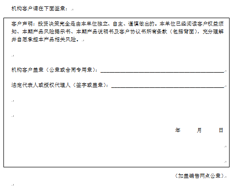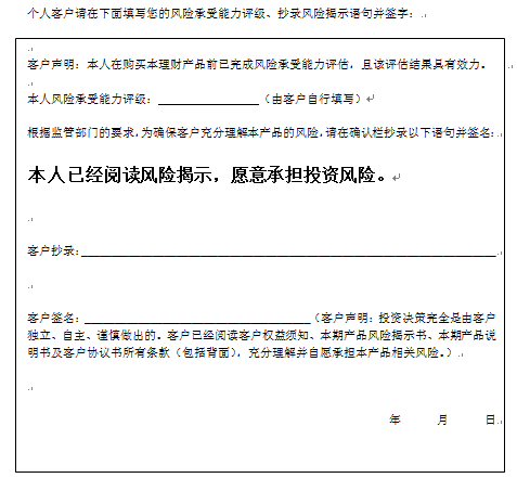 在您签署《中国建设银行股份有限公司理财产品客户协议书》前,应当仔细阅读客户权益须知、本风险揭示书及本产品的产品说明书的全部内容,同时向中国建设银行重庆市分行了解本产品的其他相关信息,并自己独立做出是否认(申)购本产品的决定。