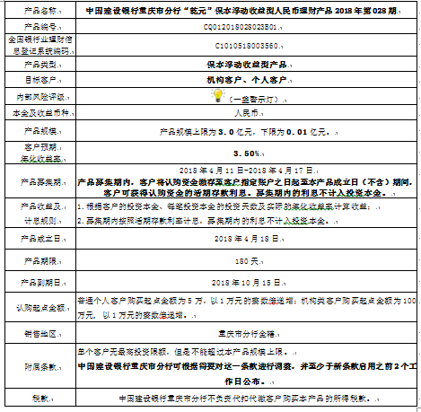 中国建设银行重庆市分行“乾元”保本浮动收益型 人民币理财产品2018年第028期风险揭示书和说明书