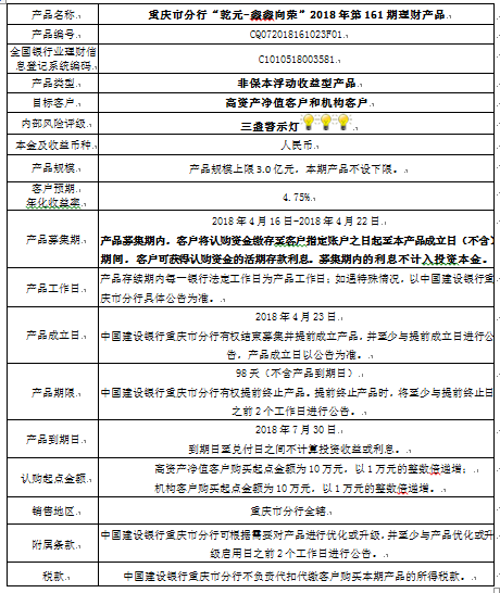 1.本期产品规模上限:3.0亿元。在本期产品募集期内,对本期产品的认购金额达到本期理财产品规模上限,则中国建设银行重庆市分行有权利但无义务停止本期产品的认购,已经认购成功的客户投资权益不受影响。
