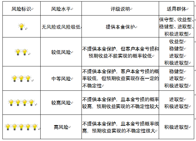 ,风险水平属于较低风险。最不利情况下,您将损失全部收益甚至包括全部本金。本理财产品适用于收益型、稳健型、进取型 、积极进取型客户。