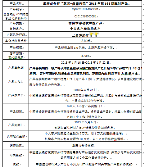 3.中国建设银行重庆市分行可根据市场情况等调整产品规模上、下限,并最迟于调整规模上下限当日进行公告。