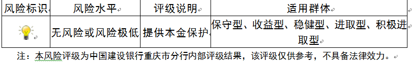 本期产品为保本浮动收益型理财产品,本理财产品有投资风险,只保障理财资金本金,不保证理财收益,您应当充分认识投资风险,谨慎投资。本期产品期限为180天(中国建设银行重庆市分行有权对产品进行展期或提前终止)。本期产品内部风险评级级别为一盏警示灯
