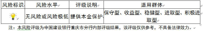 本期产品为保本浮动收益型理财产品,本理财产品有投资风险,只保障理财资金本金,不保证理财收益,您应当充分认识投资风险,谨慎投资。本期产品期限为90天(中国建设银行重庆市分行有权对产品进行展期或提前终止)。本期产品内部风险评级级别为一盏警示灯
