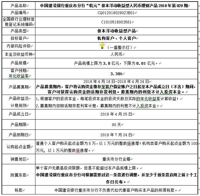人民币理财产品2018年第029期说明书