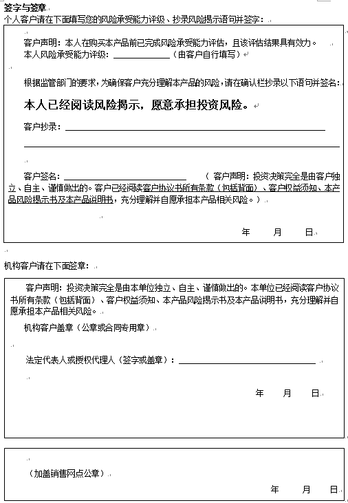 您签署本风险揭示书、客户协议书,并将资金委托给中国建设银行重庆市分行运作是您真实的意思表示。本风险揭示书及相应的客户协议书、产品说明书、客户权益须知将共同构成贵我双方理财合同的有效组成部分。