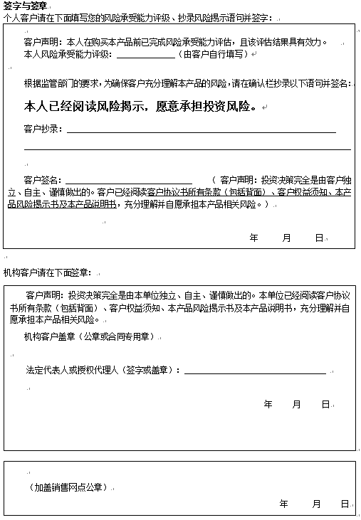 您签署本风险揭示书、客户协议书,并将资金委托给中国建设银行重庆市分行运作是您真实的意思表示。本风险揭示书及相应的客户协议书、产品说明书、客户权益须知将共同构成贵我双方理财合同的有效组成部分。