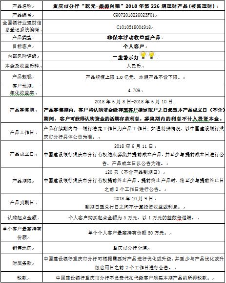 中国建设银行重庆市分行“乾元-鑫鑫向荣” 2018年第226期理财产品风险揭示书和产品说明书