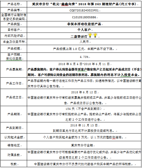 3.中国建设银行重庆市分行可根据市场情况等调整产品规模上、下限,并最迟于调整规模上下限当日进行公告。