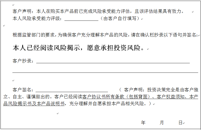 个人客户请在下面填写您的风险承受能力评级、抄录风险揭示语句并签字: