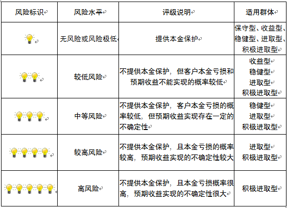 本产品为非保本浮动收益型理财产品,不保证本金和收益,请您充分认识投资风险,谨慎投资。本期产品期限为185天(中国建设银行有权对产品进行展期或提前终止),存续期内,产品不接受申购或赎回申请。本期产品内部风险评级级别为盏警示灯,风险水平属于较低风险。最不利情况下,您将损失全部收益甚至包括全部本金。本理财产品适用于收益型、稳健型、进取型 积极进取型客户。