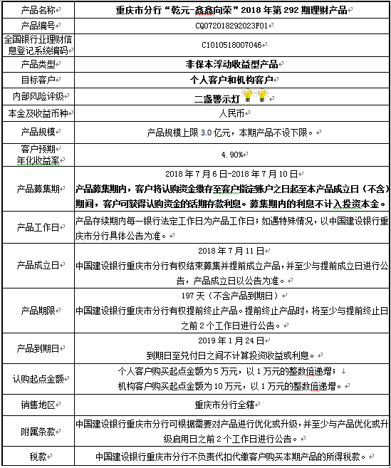 1.本期产品规模上限:3.0亿元。在本期产品募集期内,对本期产品的认购金额达到本期理财产品规模上限,则中国建设银行重庆市分行有权利但无义务停止本期产品的认购,已经认购成功的客户投资权益不受影响。