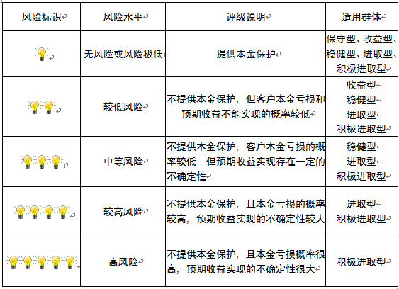 本产品为非保本浮动收益型理财产品,不保证本金和收益,请您充分认识投资风险,谨慎投资。本期产品期限为153天(中国建设银行有权对产品进行展期或提前终止),存续期内,产品不接受申购或赎回申请。本期产品内部风险评级级别为二盏警示灯,风险水平属于较低风险。最不利情况下,您将损失全部收益甚至包括全部本金。本理财产品适用于收益型、稳健型、进取型 、积极进取型客户。