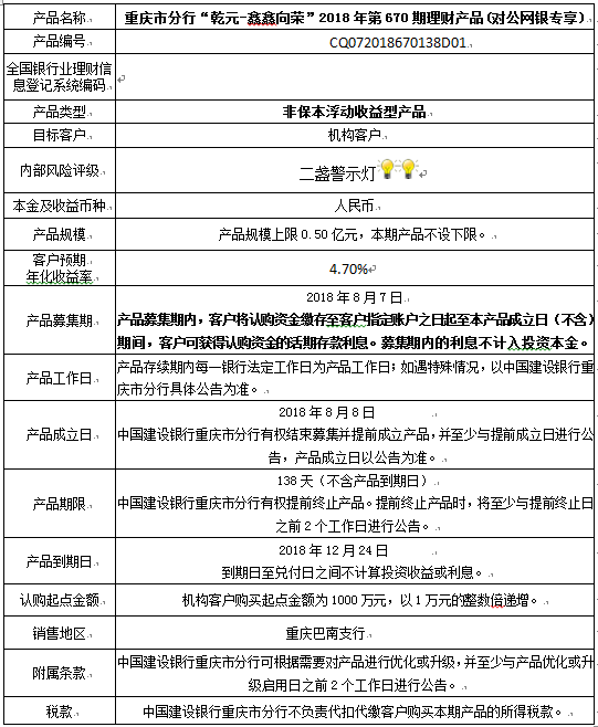 本产品为非保本浮动收益型理财产品,不保证本金和收益,请您充分认识投资风险,谨慎投资。本期产品期限为138天(中国建设银行有权对产品进行展期或提前终止),存续期内,产品不接受申购或赎回申请。本期产品内部风险评级级别为二盏警示灯,风险水平属于较低风险。最不利情况下,您将损失全部收益甚至包括全部本金。本理财产品适用于收益型、稳健型、进取型 、积极进取型客户。