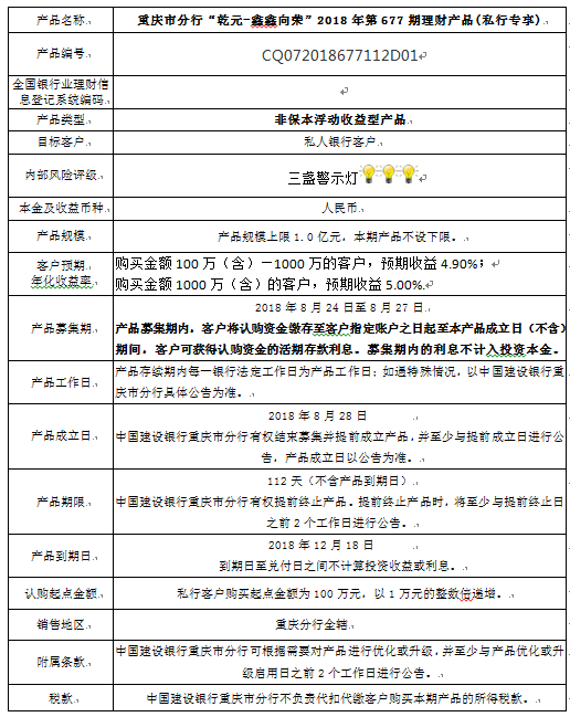 1.本期产品规模上限:1.0亿元。在本期产品募集期内,对本期产品的认购金额达到本期理财产品规模上限,则中国建设银行重庆市分行有权利但无义务停止本期产品的认购,已经认购成功的客户投资权益不受影响。