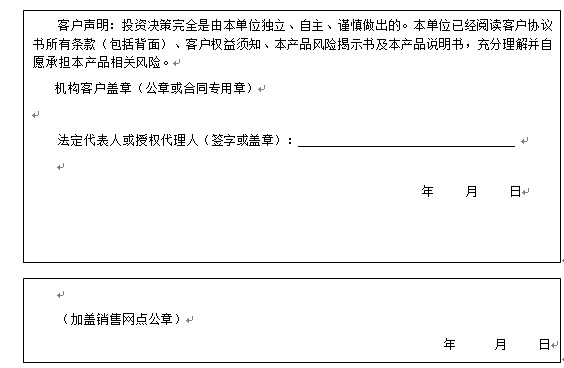 客户签名: ( 客户声明:投资决策完全是由客户独立、自主、谨慎做出的。客户已经阅读客户协议书所有条款(包括背面)、客户权益须知、本产品风险揭示书及本产品说明书,充分理解并自愿承担本产品相关风险。)