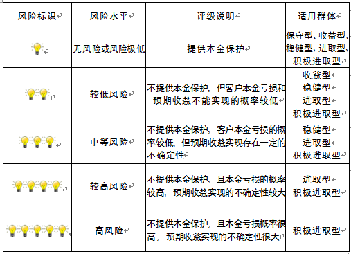 本产品为非保本浮动收益型理财产品,不保证本金和收益,请您充分认识投资风险,谨慎投资。本期产品期限为162天(中国建设银行有权对产品进行展期或提前终止),存续期内,产品不接受申购或赎回申请。本期产品内部风险评级级别为二盏警示灯 ,风险水平属于较低风险。最不利情况下,您将损失全部收益甚至包括全部本金。本理财产品适用于收益型、稳健型、进取型 、积极进取型客户。