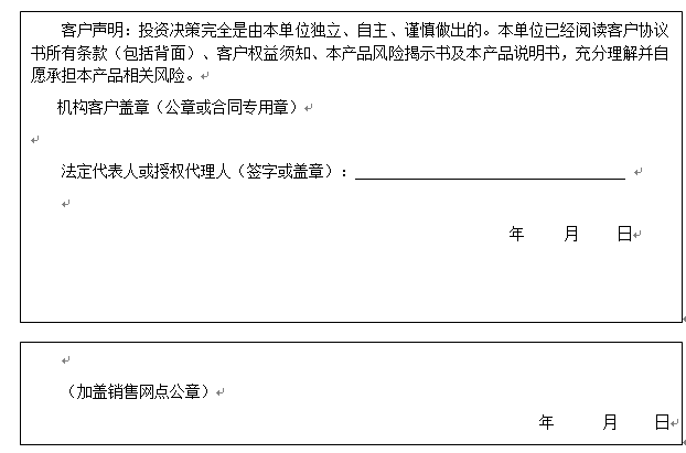 客户签名: ( 客户声明:投资决策完全是由客户独立、自主、谨慎做出的。客户已经阅读客户协议书所有条款(包括背面)、客户权益须知、本产品风险揭示书及本产品说明书,充分理解并自愿承担本产品相关风险。)