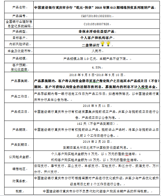 3.中国建设银行重庆市分行可根据市场情况等调整产品规模上、下限,并最迟于调整规模上下限当日进行公告。
