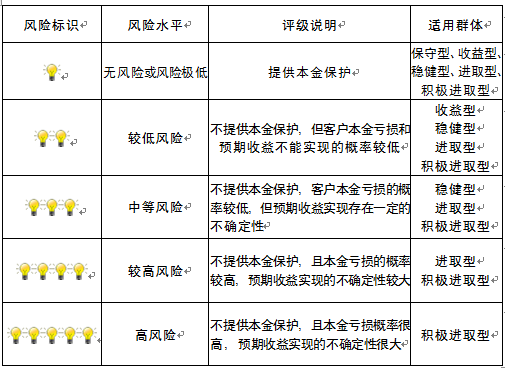本产品为非保本浮动收益型理财产品,不保证本金和收益,请您充分认识投资风险,谨慎投资。本期产品期限为273天(中国建设银行有权对产品进行展期或提前终止),存续期内,产品不接受申购或赎回申请。本期产品内部风险评级级别为三盏警示灯 ,风险水平属于中等风险。最不利情况下,您将损失全部收益甚至包括全部本金。本理财产品适用于稳健型、进取型 、积极进取型客户。