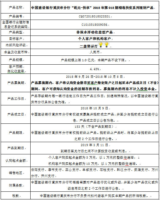 3.中国建设银行重庆市分行可根据市场情况等调整产品规模上、下限,并最迟于调整规模上下限当日进行公告。