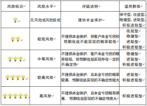 本产品为非保本浮动收益型理财产品,不保证本金和收益,请您充分认识投资风险,谨慎投资。本期产品期限为93天(中国建设银行有权对产品进行展期或提前终止),存续期内,产品不接受申购或赎回申请。本期产品内部风险评级级别为盏警示灯 ,风险水平属于中等风险。最不利情况下,您将损失全部收益甚至包括全部本金。本理财产品适用于稳健型、进取型 积极进取型客户。