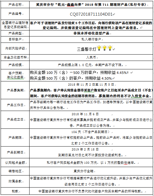 3.中国建设银行重庆市分行可根据市场情况等调整产品规模上、下限,并最迟于调整规模上下限当日进行公告。