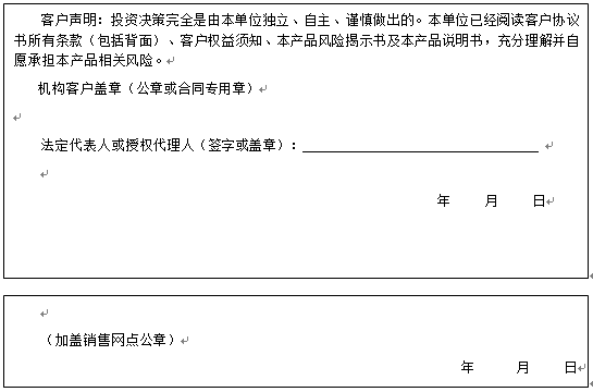 客户签名:                                    客户声明:投资决策完全是由客户独立、自主、谨慎做出的。客户已经阅读客户协议书所有条款(包括背面)、客户权益须知、本产品风险揭示书及本产品说明书,充分理解并自愿承担本产品相关风险。)