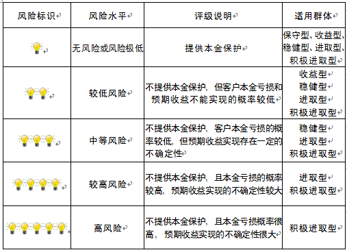 本产品为非保本浮动收益型理财产品,不保证本金和收益,请您充分认识投资风险,谨慎投资。本期产品期限为101天(中国建设银行有权对产品进行展期或提前终止),存续期内,产品不接受申购或赎回申请。本期产品内部风险评级级别为三盏警示灯,风险水平属于中等风险。最不利情况下,您将损失全部收益甚至包括全部本金。本理财产品适用于稳健型、进取型 、积极进取型客户。
