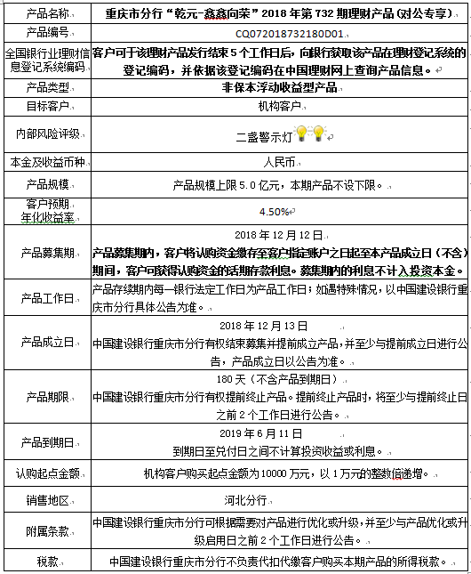 1.本期产品规模上限:5.0亿元。在本期产品募集期内,对本期产品的认购金额达到本期理财产品规模上限,则中国建设银行重庆市分行有权利但无义务停止本期产品的认购,已经认购成功的客户投资权益不受影响。