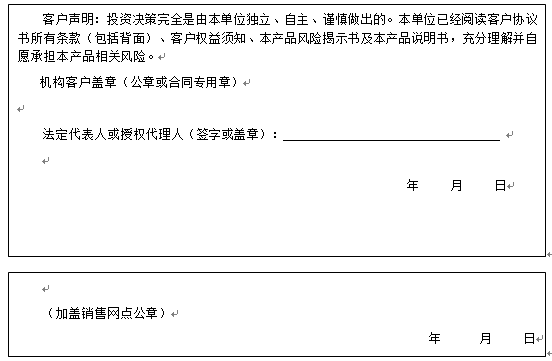 客户签名: ( 客户声明:投资决策完全是由客户独立、自主、谨慎做出的。客户已经阅读客户协议书所有条款(包括背面)、客户权益须知、本产品风险揭示书及本产品说明书,充分理解并自愿承担本产品相关风险。)