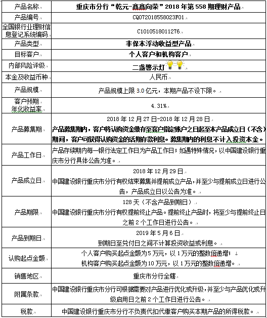 2018年第558期理财产品说明书