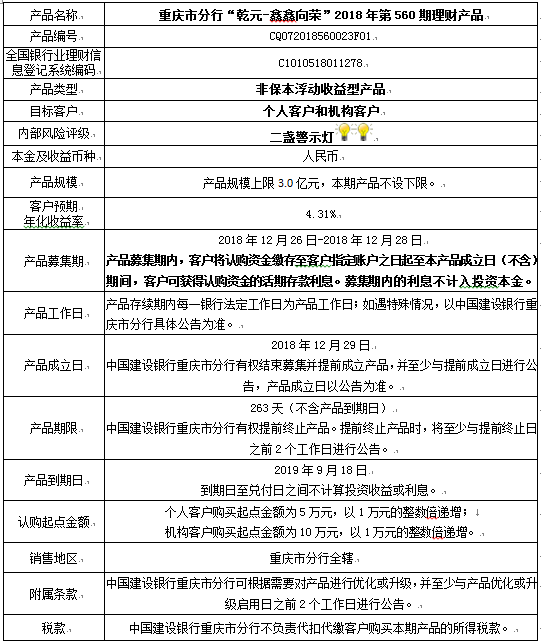 3.中国建设银行重庆市分行可根据市场情况等调整产品规模上、下限,并最迟于调整规模上下限当日进行公告。