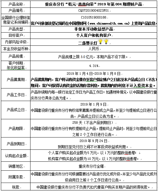 3.中国建设银行重庆市分行可根据市场情况等调整产品规模上、下限,并最迟于调整规模上下限当日进行公告。