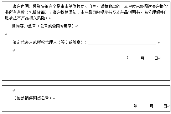 客户签名: ( 客户声明:投资决策完全是由客户独立、自主、谨慎做出的。客户已经阅读客户协议书所有条款(包括背面)、客户权益须知、本产品风险揭示书及本产品说明书,充分理解并自愿承担本产品相关风险。)