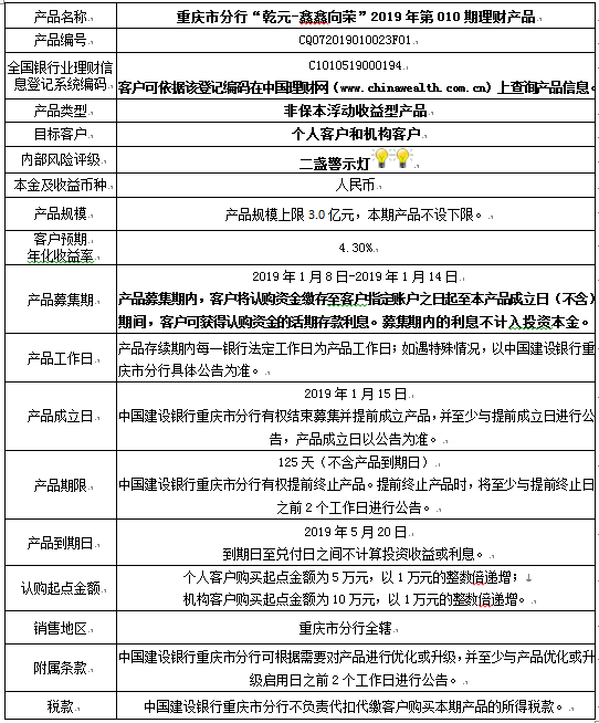 3.中国建设银行重庆市分行可根据市场情况等调整产品规模上、下限,并最迟于调整规模上下限当日进行公告。