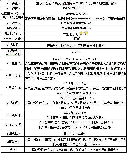 中国建设银行重庆市分行“乾元-鑫鑫向荣” 2019年第012期理财产品风险揭示书和产品说明书