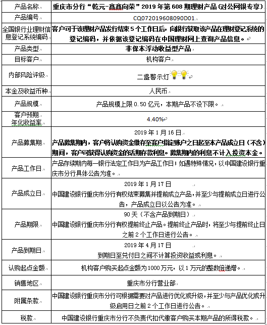 3.中国建设银行重庆市分行可根据市场情况等调整产品规模上、下限,并最迟于调整规模上下限当日进行公告。