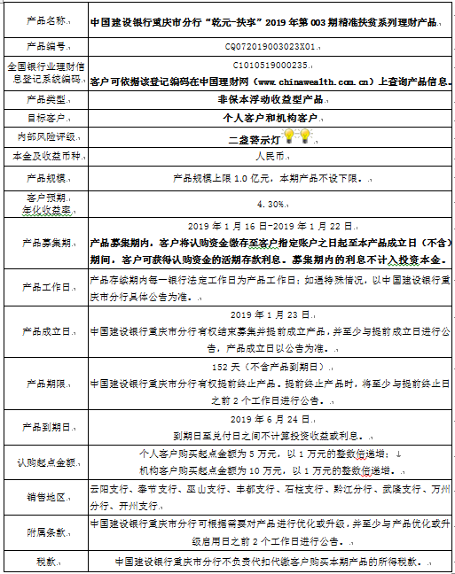 3.中国建设银行重庆市分行可根据市场情况等调整产品规模上、下限,并最迟于调整规模上下限当日进行公告。