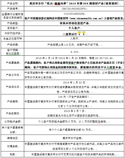 中国建设银行重庆市分行“乾元-鑫鑫向荣” 2019年第024期理财产品风险揭示书和产品说明书