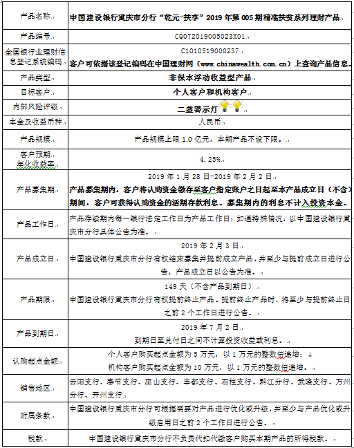 中国建设银行重庆市分行“乾元-扶享” 2019年第005期精准扶贫系列理财产品风险揭示书和产品说明书