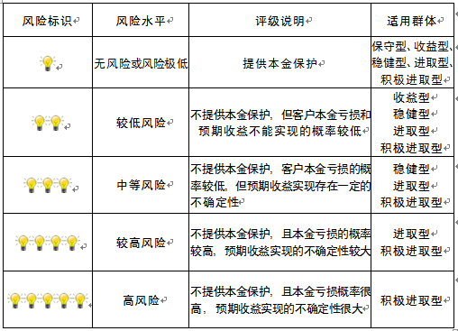 本产品为非保本浮动收益型理财产品,不保证本金和收益,请您充分认识投资风险,谨慎投资。本期产品期限为127天(中国建设银行有权对产品进行展期或提前终止),存续期内,产品不接受申购或赎回申请。本期产品内部风险评级级别为二盏警示灯 ,风险水平属于较低风险。最不利情况下,您将损失全部收益甚至包括全部本金。本理财产品适用于收益型、稳健型、进取型 、积极进取型客户。