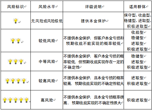 本产品为非保本浮动收益型理财产品,不保证本金和收益,请您充分认识投资风险,谨慎投资。本期产品期限为98天(中国建设银行有权对产品进行展期或提前终止),存续期内,产品不接受申购或赎回申请。本期产品内部风险评级级别为三盏警示灯,风险水平属于中等风险。最不利情况下,您将损失全部收益甚至包括全部本金。本理财产品适用于稳健型、进取型 、积极进取型客户。