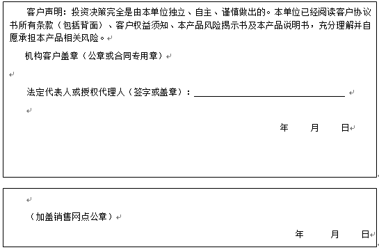 客户签名: ( 客户声明:投资决策完全是由客户独立、自主、谨慎做出的。客户已经阅读客户协议书所有条款(包括背面)、客户权益须知、本产品风险揭示书及本产品说明书,充分理解并自愿承担本产品相关风险。)