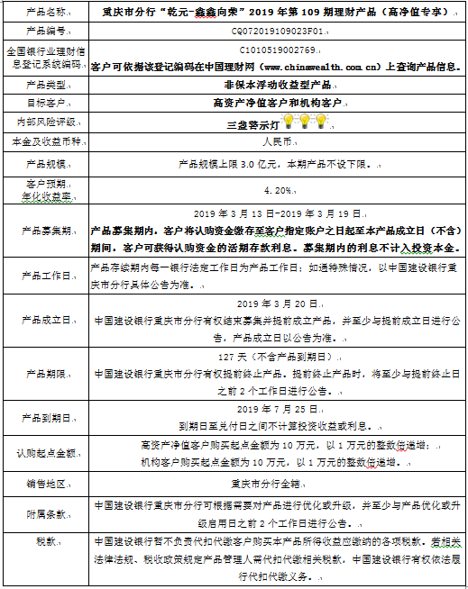 3.中国建设银行重庆市分行可根据市场情况等调整产品规模上、下限,并最迟于调整规模上下限当日进行公告。