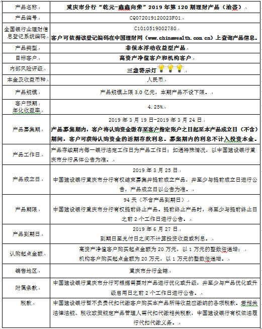 3.中国建设银行重庆市分行可根据市场情况等调整产品规模上、下限,并最迟于调整规模上下限当日进行公告。