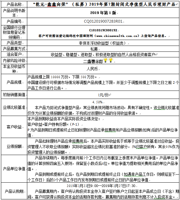 本产品为封闭式净值型理财产品,不保证本金和收益,请您充分认识投资风险,谨慎投资。本产品任何业绩比较基准、测算收益或类似表述均属不具有法律约束力的用语,不代表客户可能获得的实际收益,亦不构成中国建设银行重庆市分行对本产品的任何收益承诺。产品期限为固定期限(中国建设银行重庆市分行有权提前终止产品),存续期内产品不接受赎回申请。 本期产品内部风险评级级别为二盏警示灯 ,风险程度属于较低风险,适用于收益型、稳健型、进取型和积极进取型客户。最不利情况下,本期产品投资的资产无法回收任何本金和净收益,客户将损失全部本金。投资者不得使用贷款、发行债券等筹集的非自有资金投资本产品。如影响您风险承受能力的因素发生变化,请及时完成风险承受能力评估。