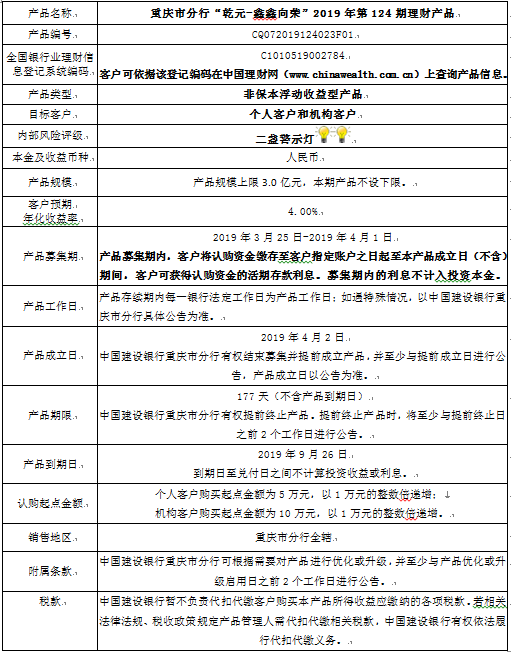 中国建设银行重庆市分行“乾元-鑫鑫向荣” 2019年第124期理财产品风险揭示书和产品说明书