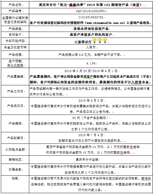 中国建设银行重庆市分行“乾元-鑫鑫向荣” 2019年第123期理财产品风险揭示书和产品说明书